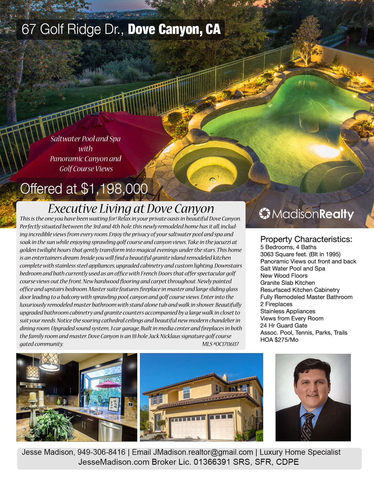 Incredible Dove Canyon home just listed! Panoramic view from front and back of home. Stunning Saltwater Pool and Spa. Location Location Location on Golf Course! Listed at $1,200,000. Must See! Call to schedule a private showing with Jesse Madison at 949-306-8416.