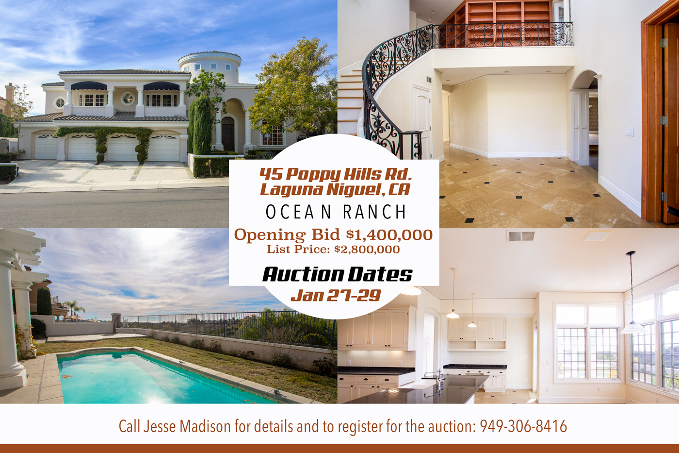 List price is $2,800,000. So take advantage of this opportunity and contact us today to find out how to register for our auction and bid on this home. Call Jesse for a private showing at 949-306-8416 or email at Jesse@JesseMadison.com.