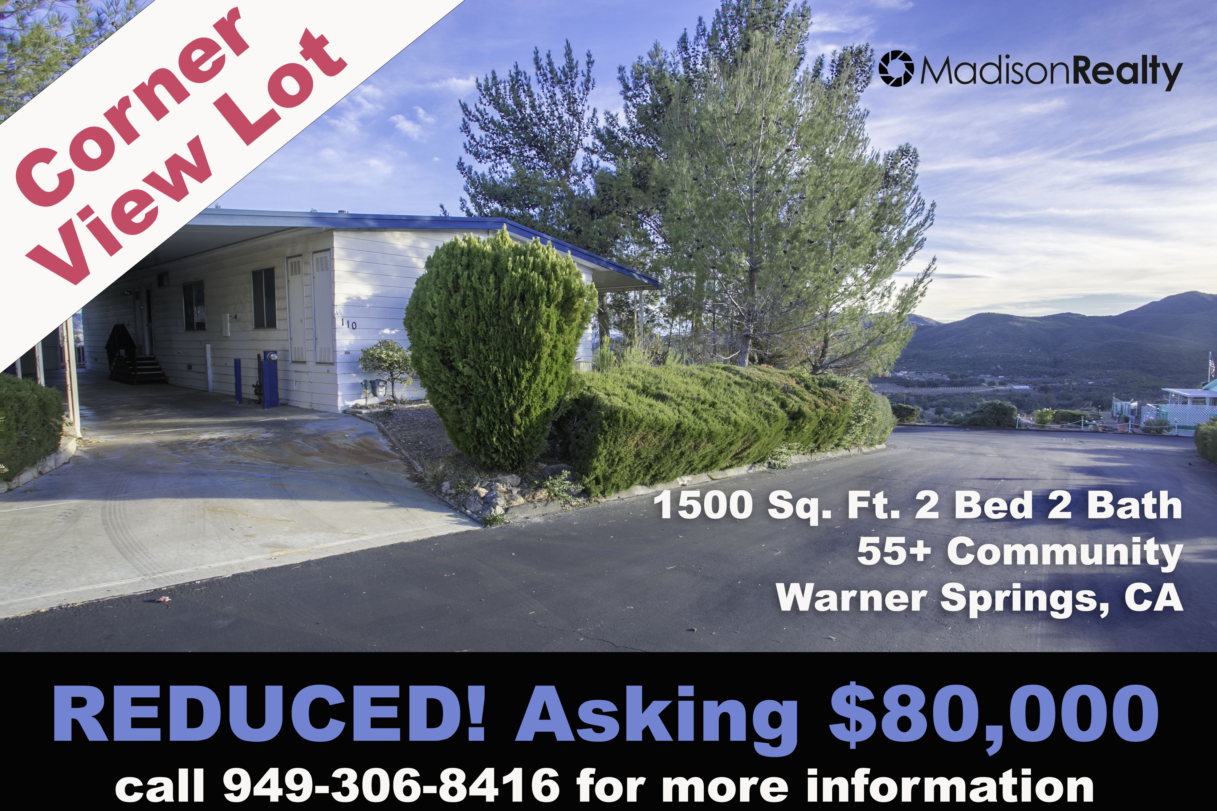 Beautiful corner lot property with panoramic mountain views. Located in Stone Ridge Senior 55+ community in beautiful Warner Springs. Private location with 2 car covered carport and covered patio. Separate family room and living room. Spacious dining room. Private Master Suite. A/C unit, Storage Shed in back. Affordable Senior Living near Warner Springs Ranch Resort where you can find golfing, hiking, biking, spa services and more. Also just 40 miles from Temecula for all your needs! Must See this view home!
